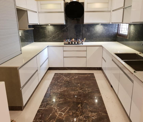 A premium layout that adds extra workspace and enhances the visual appeal of open kitchen designs.
