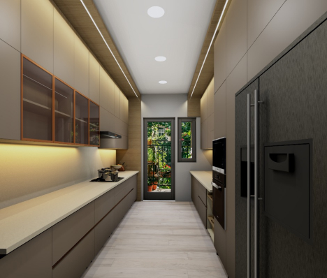 Designed for narrow kitchens, creating clear separation between cooking and storage areas for better efficiency.